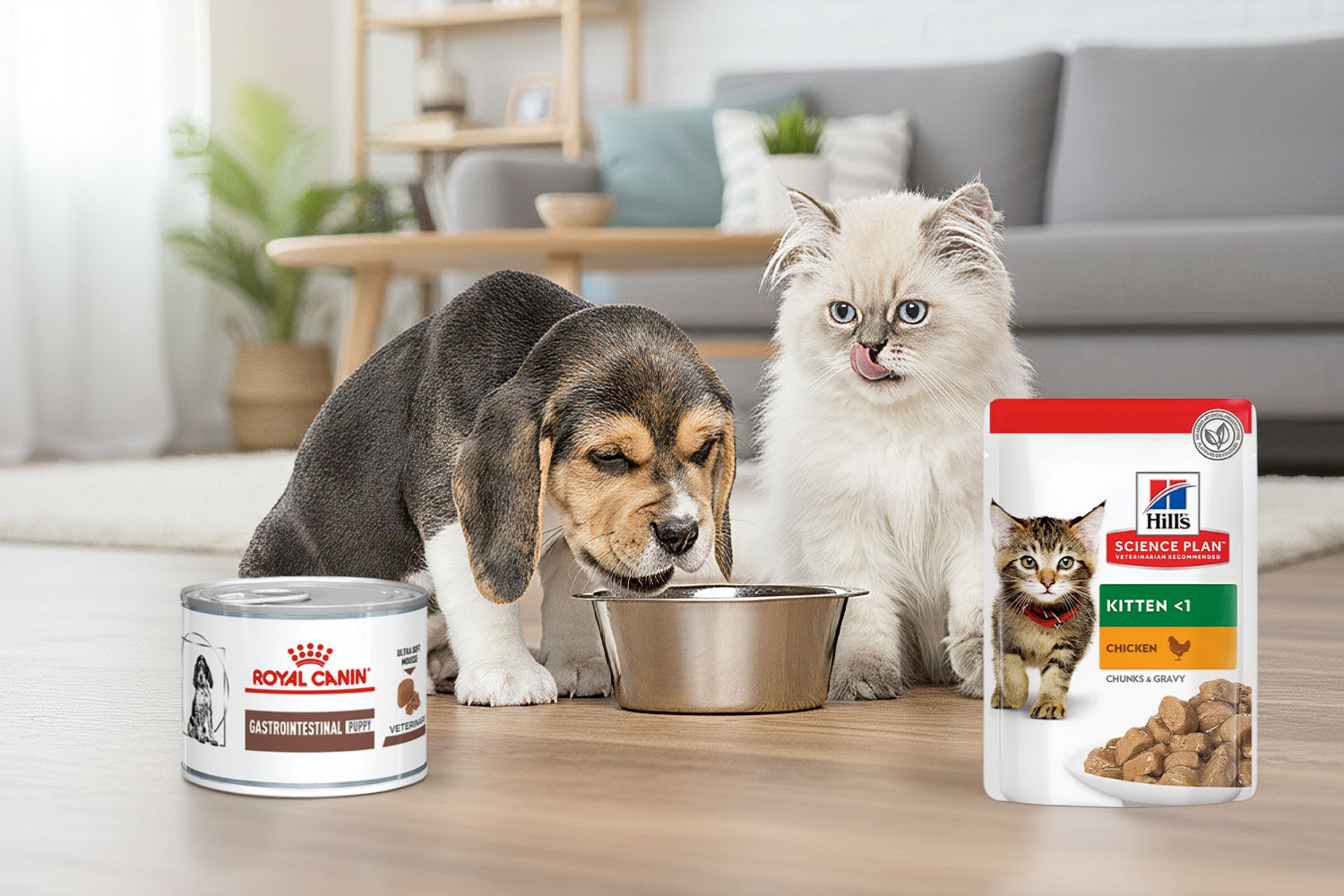 - Hrana umedă (conserve și pate-uri) – este mai gustoasă și mai ușor de digerat pentru puii care au dinți sensibili. Hrana umedă poate fi combinată cu cea uscată pentru a asigura varietate și hidratare.