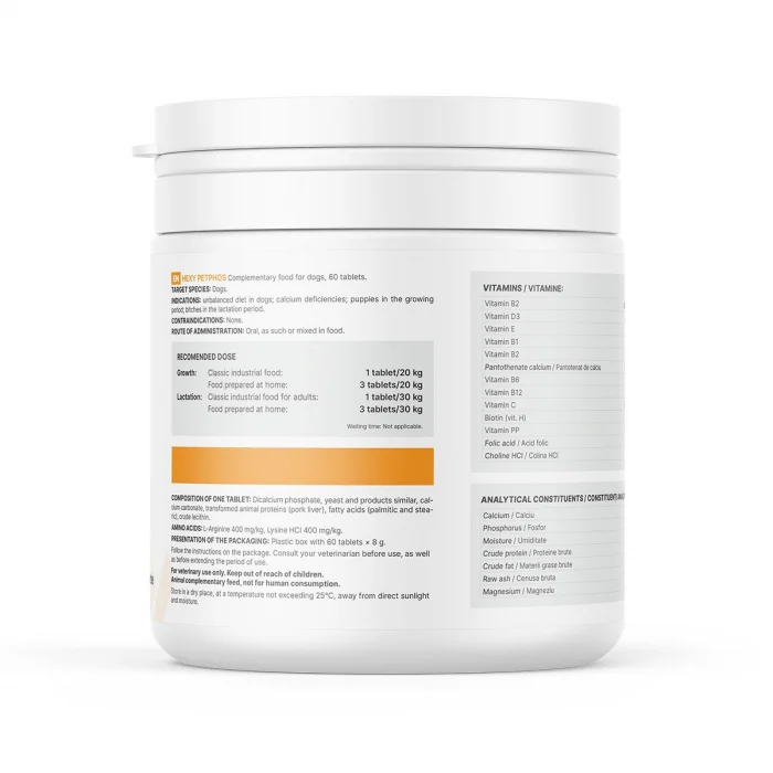 Hexy Pet Phos este un supliment alimentar cu vitamine și minerale pentru câinii care prezintă carențe de calciu, căței aflați în perioada de creștere sau cățele aflate în perioada de lactație.