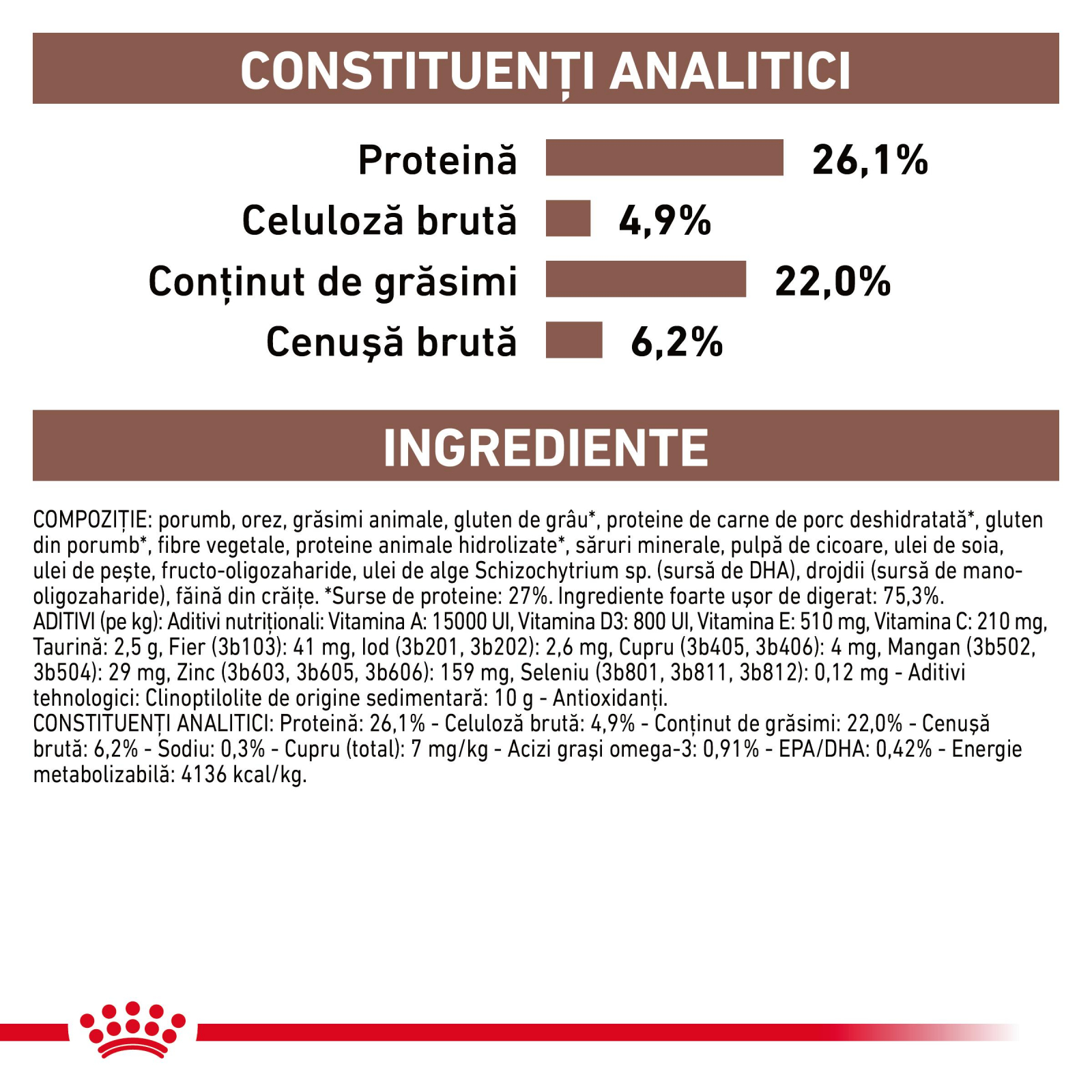 Orez, grăsimi animale, porumb, gluten din grâu, proteine din carne deshidratată de porc, gluten din porumb, fibre vegetale, hidrolizat din ficat de pasăre, minerale, pulpă de cicoare, ulei de pește, ulei de soia, Fructo-Oligo-Zaharide, drojdie hidrolizată (sursă de manan-oligo-zaharide), extract de gălbenele (sursă de luteină). Surse de proteine: proteine din carne deshidratată de porc, gluten din porumb, gluten din grâu, hidrolizat din ficat de pasăre.