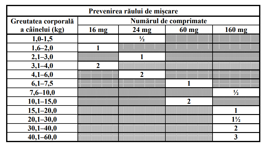 • Pentru prevenirea vomei indusă de răul de mișcare, Cerenia comprimate trebuie să fie administrate o dată pe zi, în doză de 8 mg maropitant pe kg greutate corporală, utilizând numărul de comprimate prezentat în tabelul de mai jos. De asemenea, comprimatele trebuie administrate cu cel puţin 1 oră înainte de începerea călătoriei, iar efectul antiemetic persistă pentru cel puţin 12 ore.
