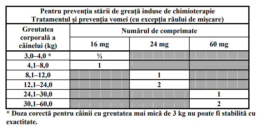 • Pentru tratamentul sau prevenirea vomei, Cerenia comprimate trebuie să fie administrate o dată pe zi, într-o doză de 2 mg maropitant pe kg greutate corporală, utilizând numărul de comprimate prezentat în tabelul de mai jos. De asemenea, comprimatele trebuie să fie administrate cu mai mult de 1 oră în avans, iar durata efectului este de aproximativ 24 de ore.