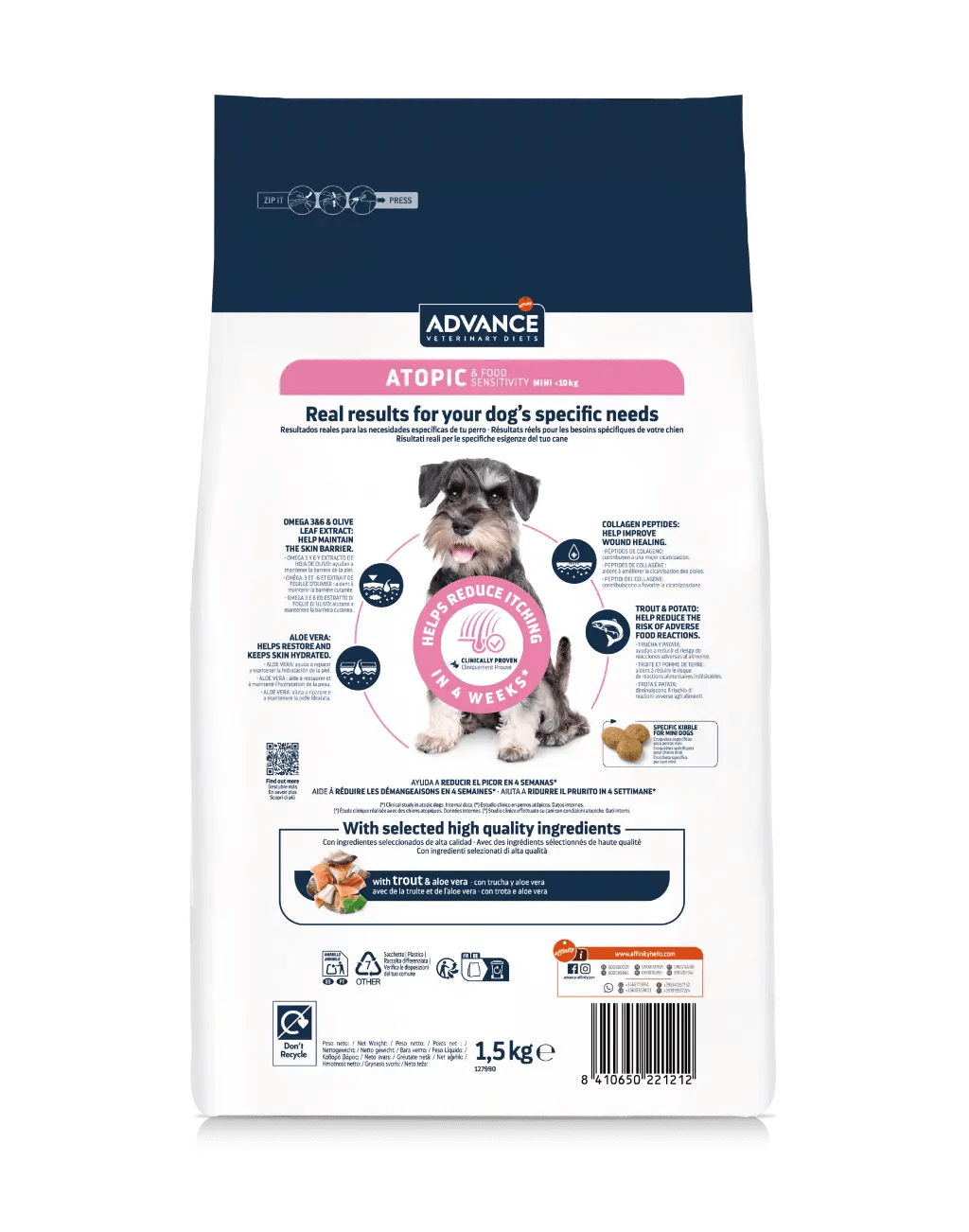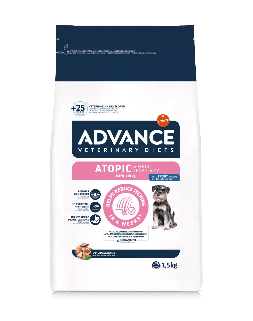• ADVANCE VETERINARY DIETS Atopic Mini este o hrană dietetică, pentru câini adulți și căței de peste 4 luni de talie mică, formulată pentru îngrijirea pielii în caz de dermatită atopică și pentru reducerea intoleranțelor la ingrediente și nutrienți.