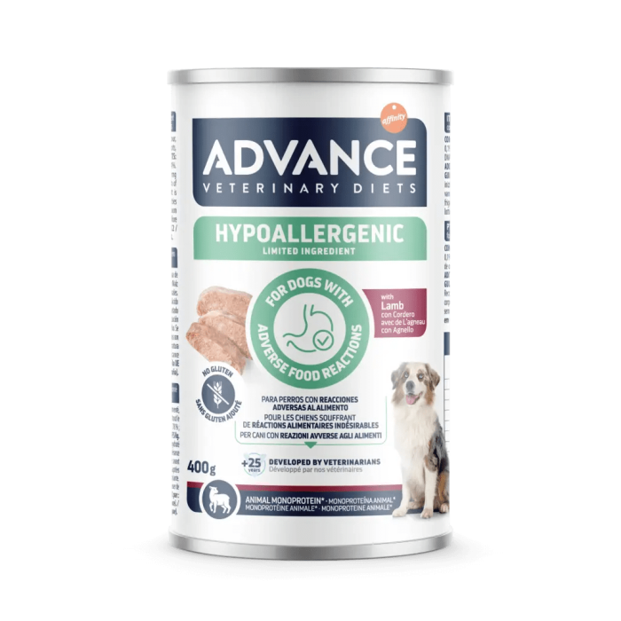 • ADVANCE VETERINARY DIETS Hypoallergenic cu miel este o hrană dietetică formulată pentru câinii de toate taliile care au reacții adverse la hrană. Această conservă este preparată cu miel, singura sursă de proteină, și carbohidrați fără gluten care minimizează riscul de reacții adverse.