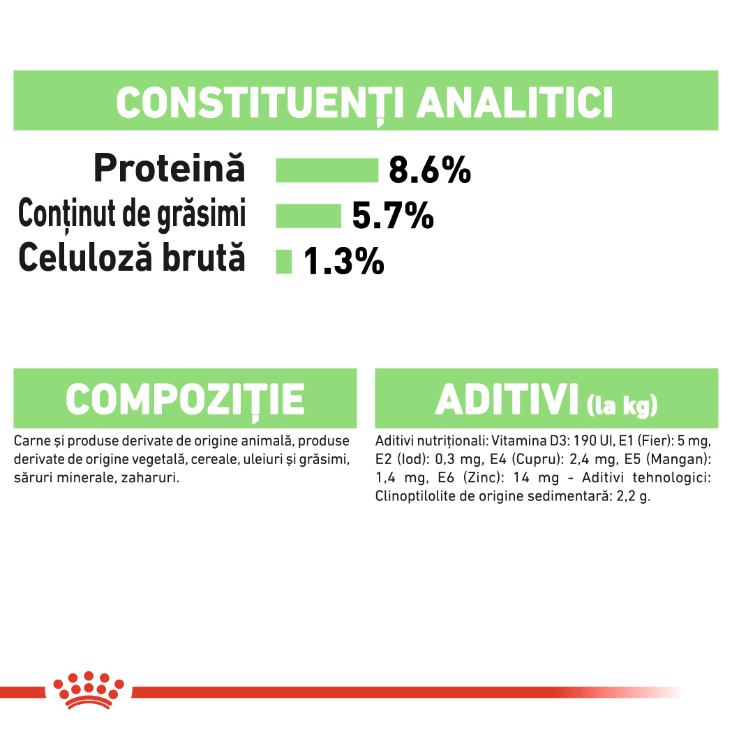 ROYAL CANIN Digestive Care tip pate este o hrană umedă care conține proteine cu nivel ridicat de digestibilitate, precum și un mix de prebiotice pentru o floră intestinală echilibrată, ceea ce favorizează în final aspectul optim al scaunului.