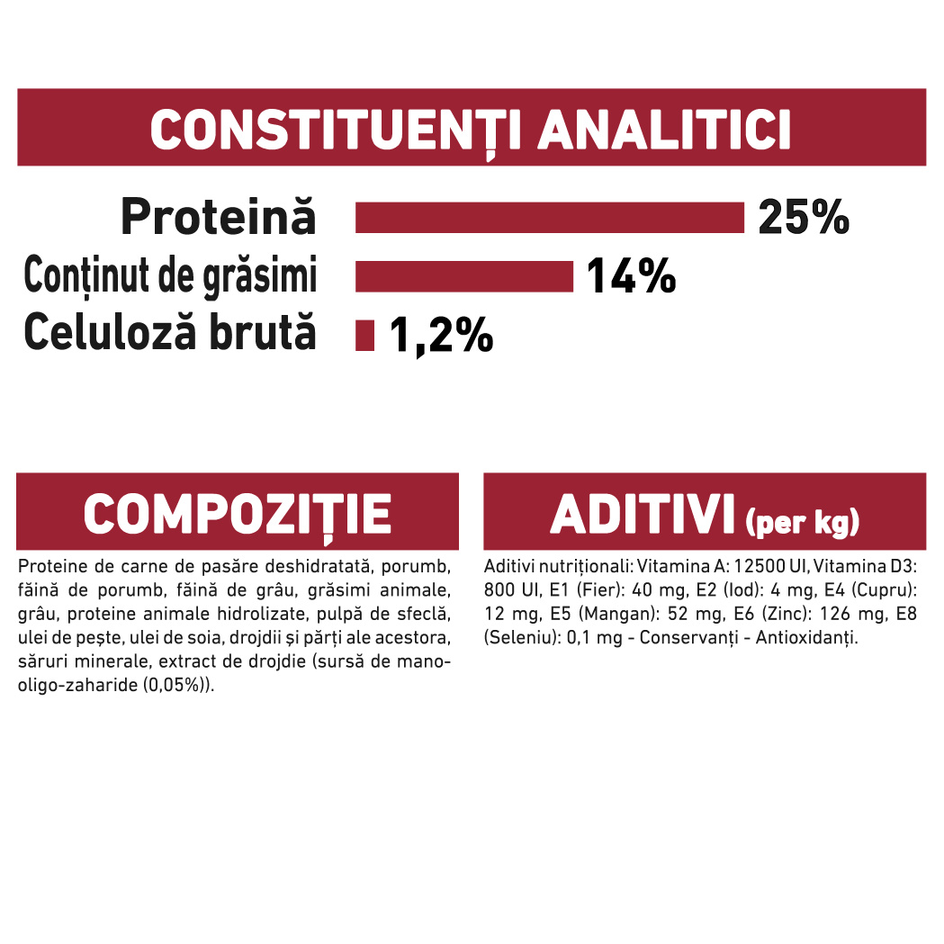 Proteine de carne de pasăre deshidratată, grâu, făină de porumb, făină de grâu, porumb, proteine animale hidrolizate, grăsimi animale, proteine de carne de vită şi de porc deshidratată, orz, gluten din porumb, pulpă de sfeclă, săruri minerale, ulei de soia, produse din drojdii, ulei de peşte, drojdii (sursă de mano-oligozaharide), ulei de alge Schizochytrium sp.