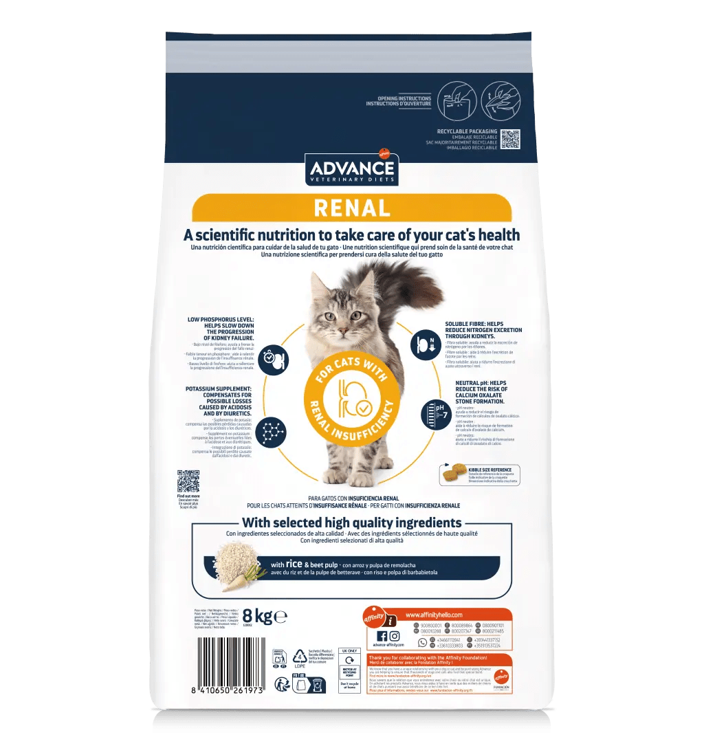 ADVANCE VETERINARY DIETS Renal este un hrană completă pentru pisici adulte, cu un nivel redus de proteine și un conținut scăzut de fosfor, și este recomandată în special pentru susținerea funcției renale la pisicile cu boală renală cronică.
