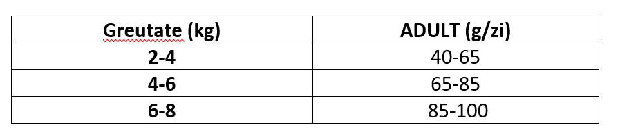 Atenție: În cazul în care pisica va primi și hrană umedă, atunci cantitatea de hrană uscată va trebui sa fie ajustată. A se verifica ambalajul pentru a stabili cantitatea potrivită.