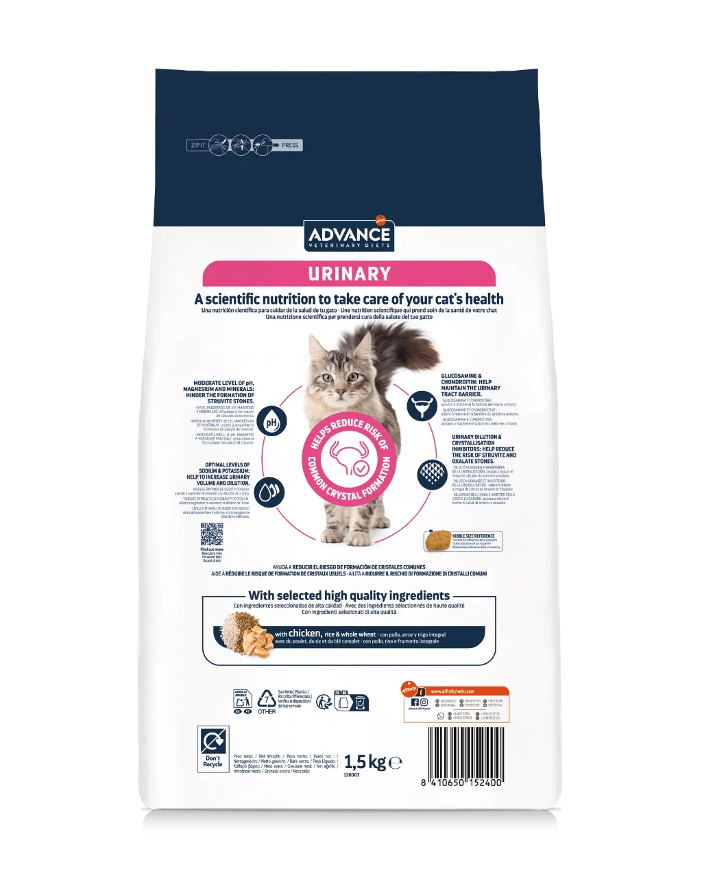 ADVANCE VETERINARY DIETS Urinary este o hrană dietetică cu un nivel moderat de magneziu și este indicată pentru a ajuta la reducerea apariției calculilor de struvit și oxalat în urină la pisicile adulte.