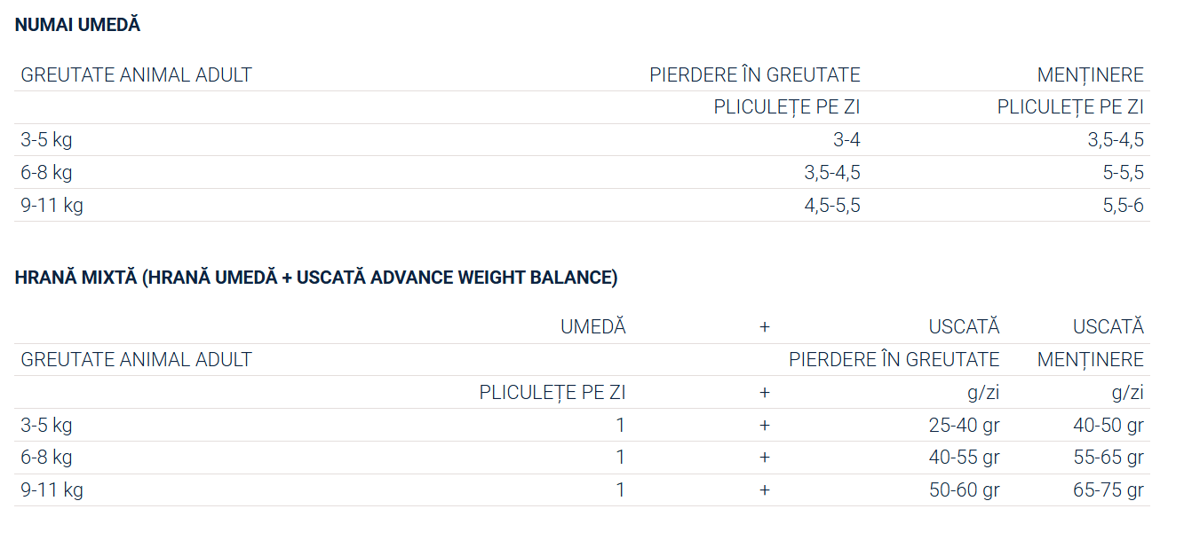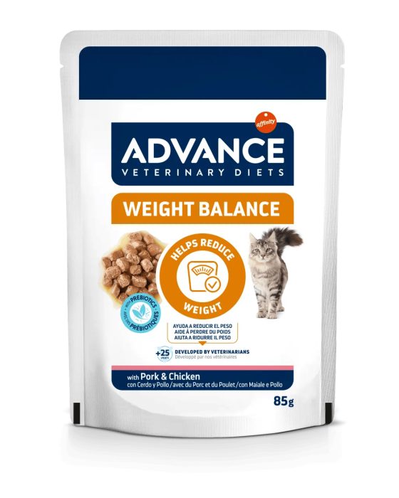 ADVANCE VETERINARY DIETS Weight Balance este o hrană dietetică pentru pisici adulte, formulată pentru a reduce greutatea corporală excesivă și a regla metabolismul lipidelor în caz de hiperlipidemie.