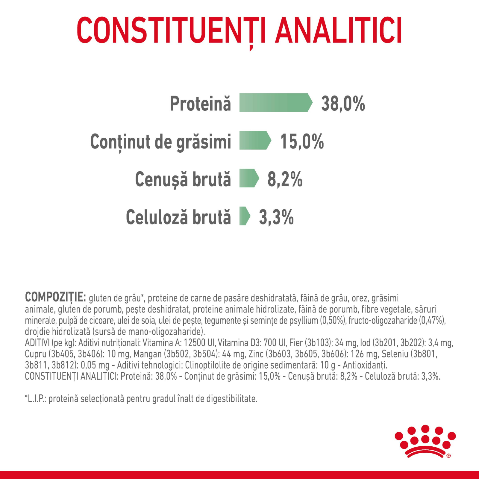 Gluten de grâu*, proteine de carne de pasăre deshidratată, făină de grâu, orez, grăsimi animale, gluten de porumb, peşte deshidratat, proteine animale hidrolizate, făină de porumb, fibre vegetale, săruri minerale, pulpă de cicoare, ulei de soia, ulei de peşte, tegumente şi seminţe de psyllium (0.5%), fructo-oligozaharide (0.47%), drojdie hidrolizată (sursă de mano-oligozaharide).