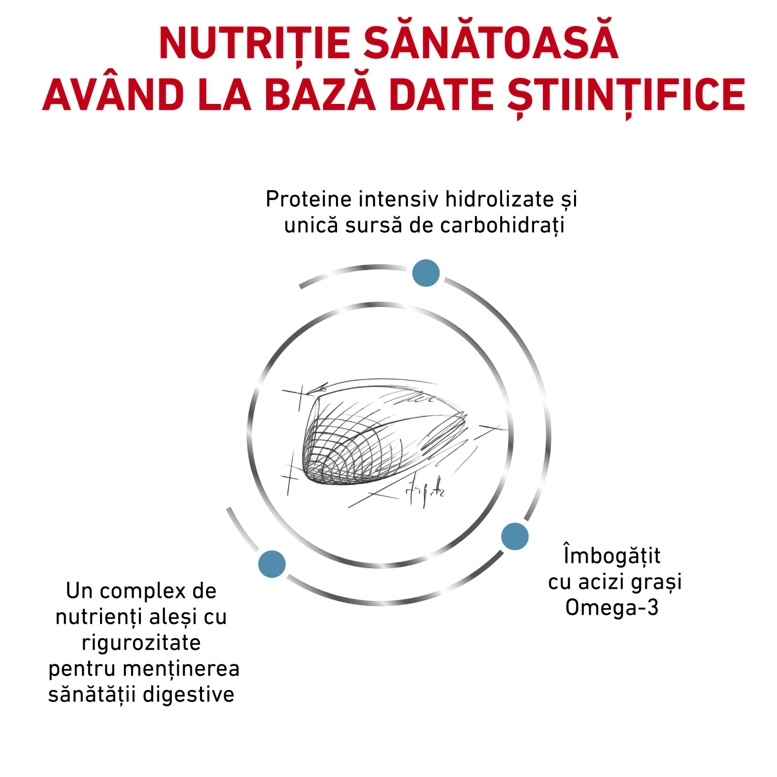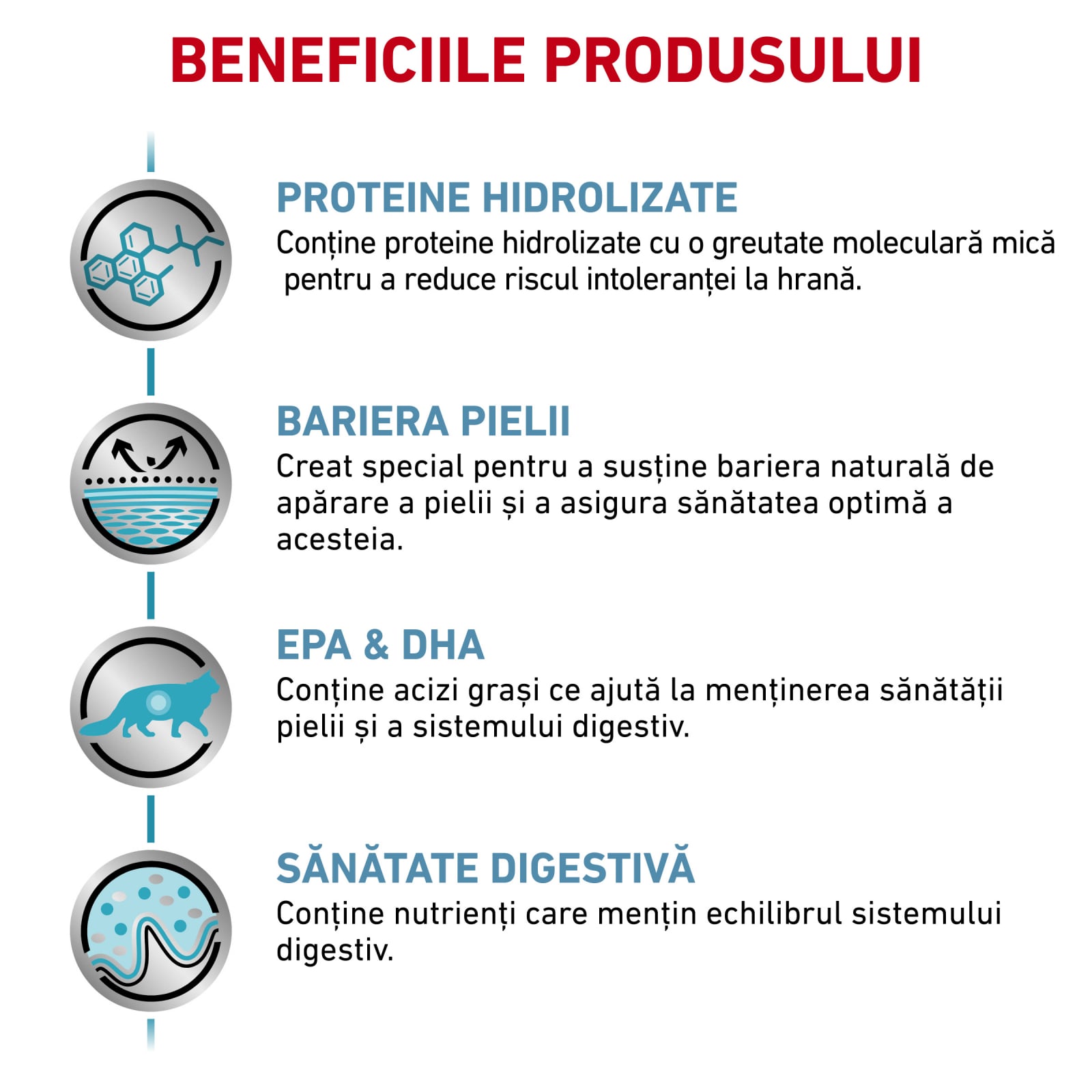 • Prezența proteinelor hidrolizate: Proteine cu greutate moleculară redusă pentru a asigura beneficiul hipoalergenic al hranei.