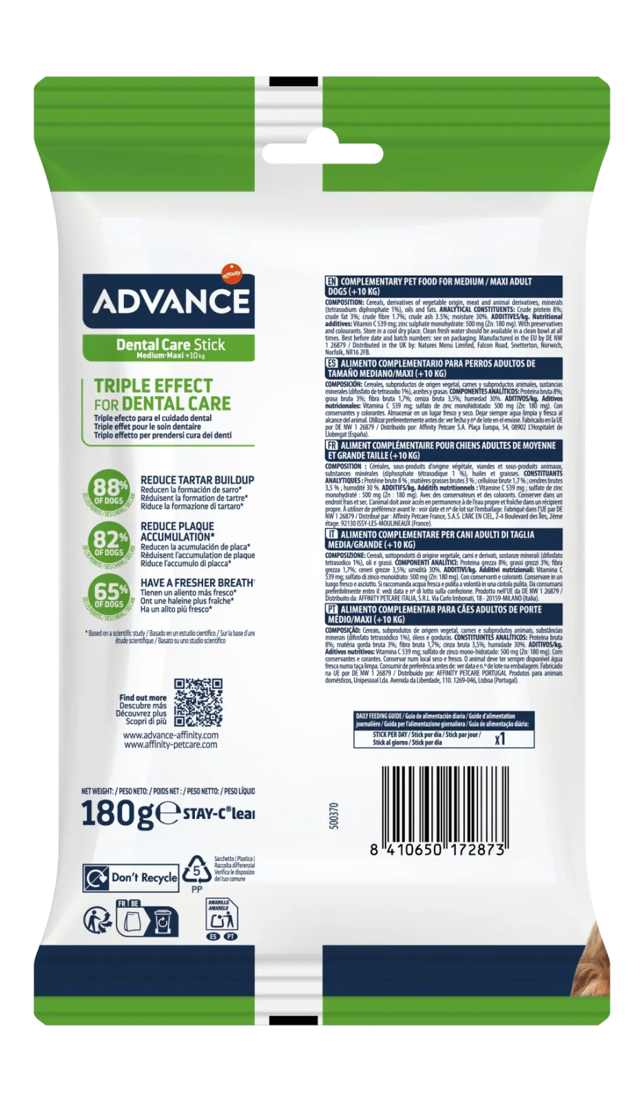 ADVANCE DENTAL CARE Sticks Medium/Maxi sunt recompense care ajută câinii de talie medie și mare să aibă dinți mai puternici și o respirație proaspătă. Multumită formulei sale dovedite științific, câinele va avea mai puțin tartru și mai puțină placă bacteriană.