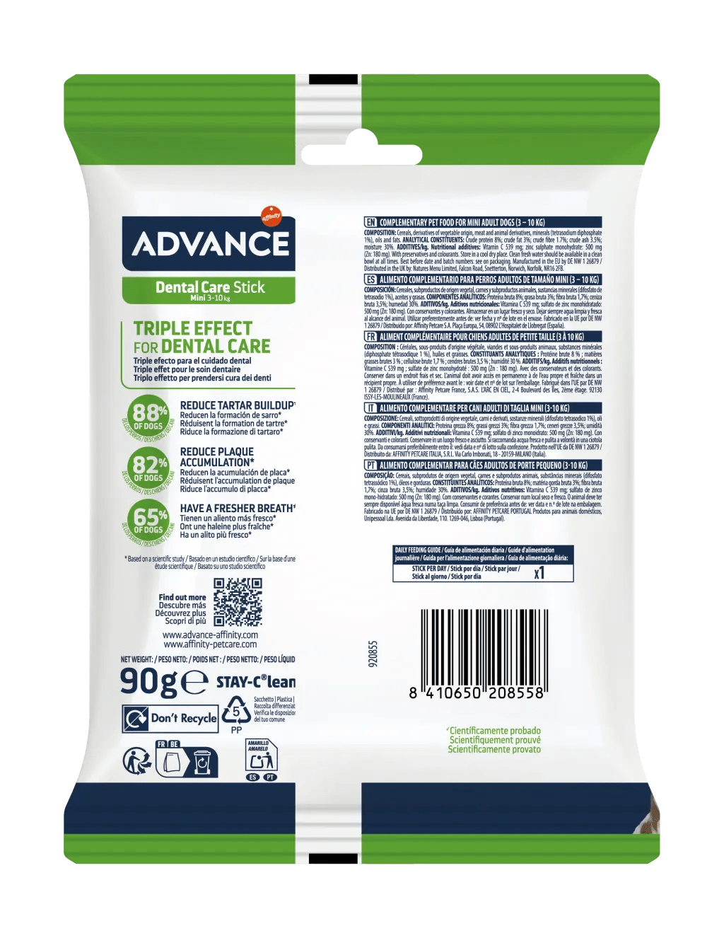 ADVANCE DENTAL CARE Sticks Mini sunt recompense care ajută câinii de talie mică să aibă dinți mai puternici și o respirație proaspătă. Mulțumită formulei sale dovedite științific, câinele va avea mai puțin tartru și mai puțină placă bacteriană.